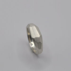 Beim Earcuff „Erstarrt“ wird die klare Grundform durch Brüche und Strukturen ergänzt. Seine unregelmäßig geschliffene Oberfläche erinnert an steinerne Skulpturen, die in mattem Silber neu interpretiert wurden. Die offene Form schmiegt sich leicht an das Ohr und setzt einen markanten, aussagekräftigen Akzent.