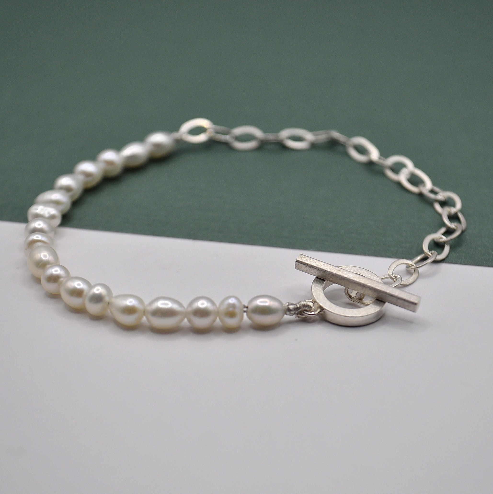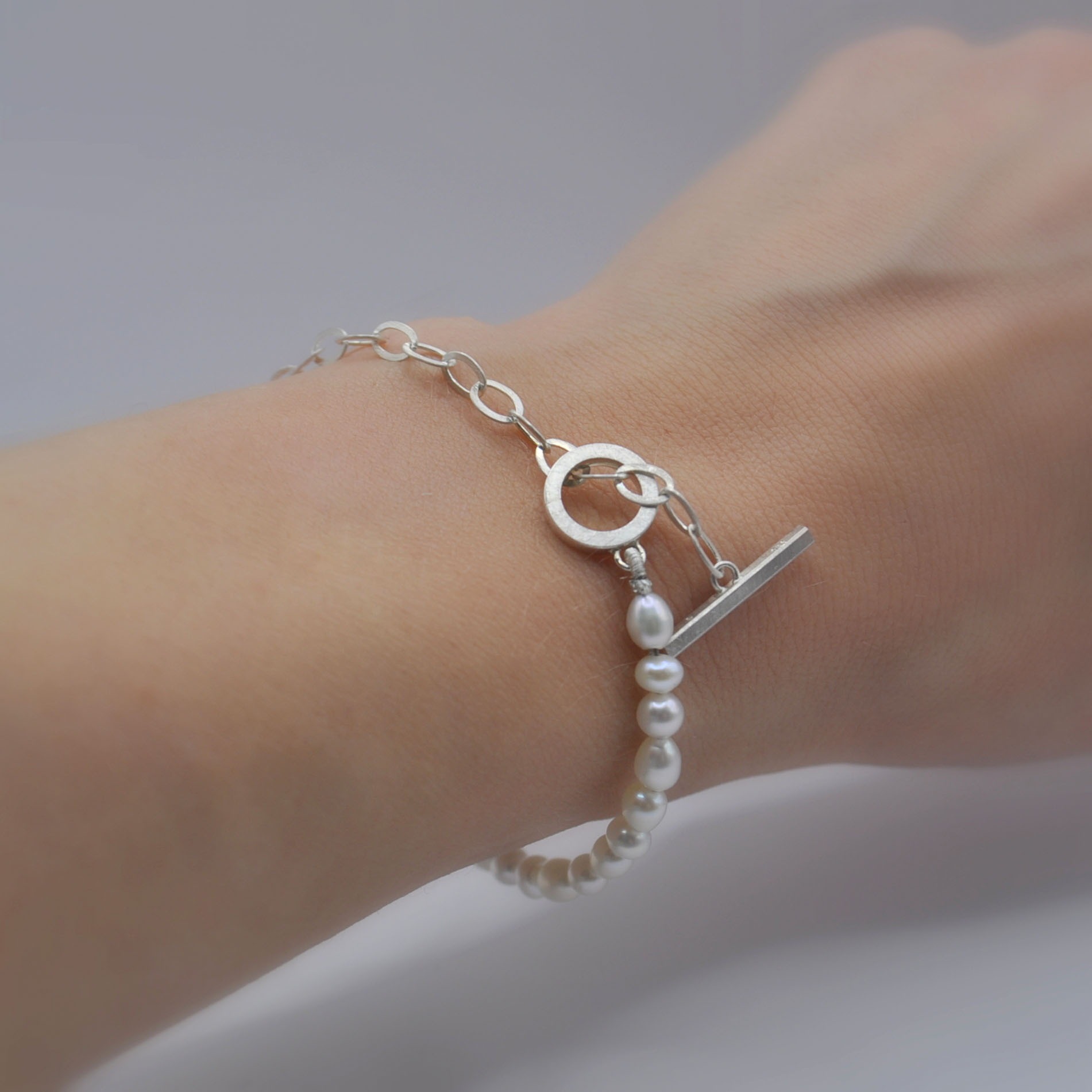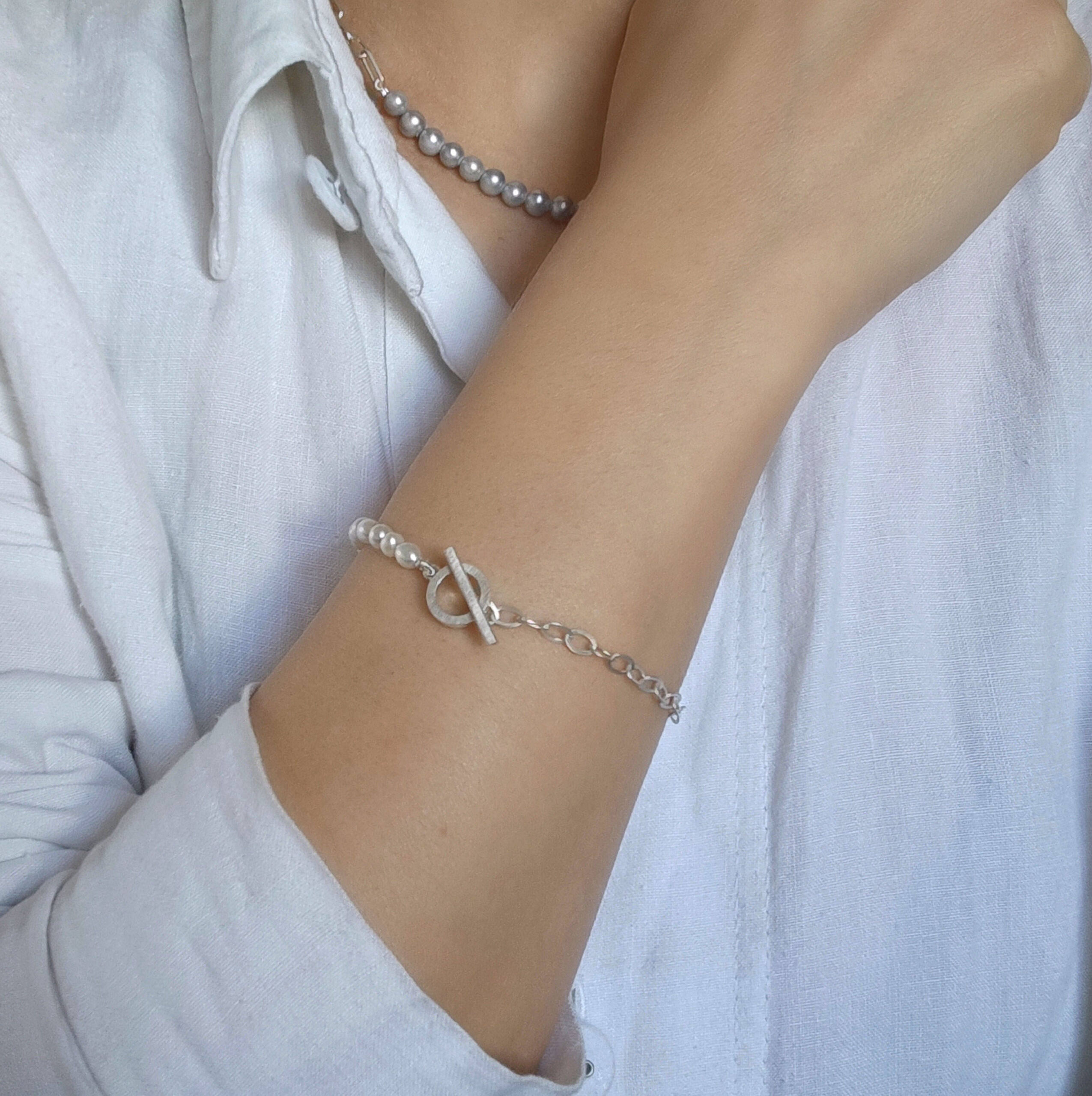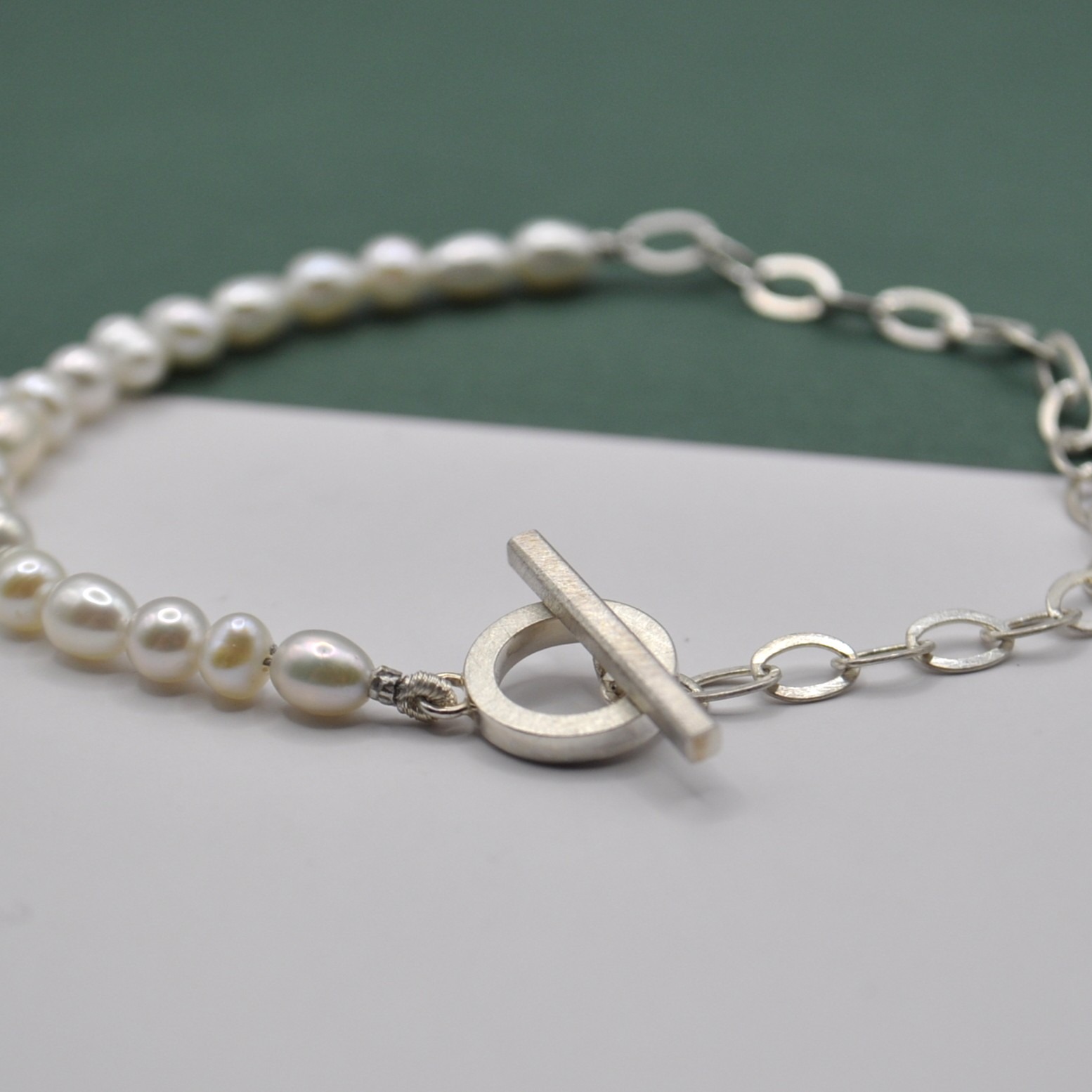Auf der einen Seite reihen sich die unterschiedlichsten Süßwasserzuchtperlen auf einem stabilen Stahlseil aneinander – organisch, lebendig, jede mit eigener Form. Die andere Hälfte wird von einer Silberkette geprägt, deren ovale Glieder dem Armband eine kühle, moderne Note verleihen. Und weil wir ständig in Bewegung sind, verändert sich auch der Look: Mal stehen die Perlen im Vordergrund, mal übernimmt die Kette das Statement.