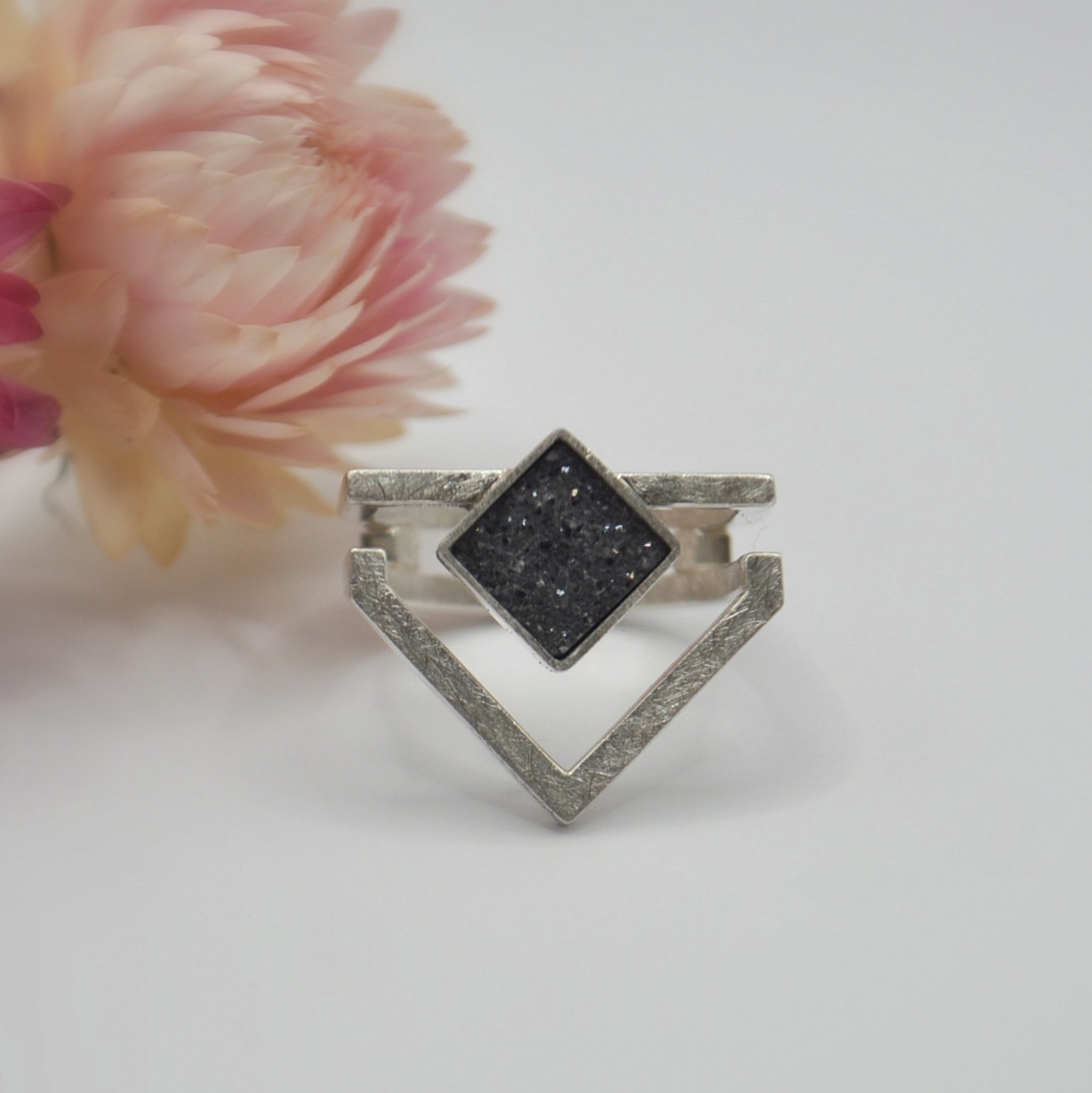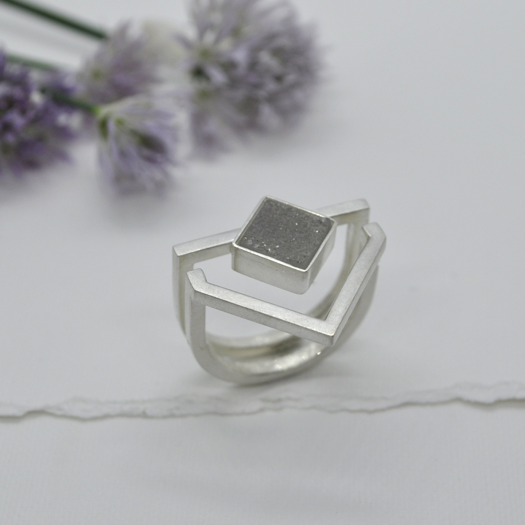 „Verdoppelt“ ist nur ein Ring, aber mit doppelter Wirkung. Beeinflusst vom Stil des Art Déco wird die quadratische Form des Edelsteins auf einer Seite verdoppelt. Hochglänzendes Silber bildet dabei einen spannenden Kontrast zur rauen Oberfläche des weißen Quarzkristalls. Ein waschechtes Einzelstück und modernes Statement Piece für deine Hand. Der Ring wurde in reiner Handarbeit für dich hergestellt.